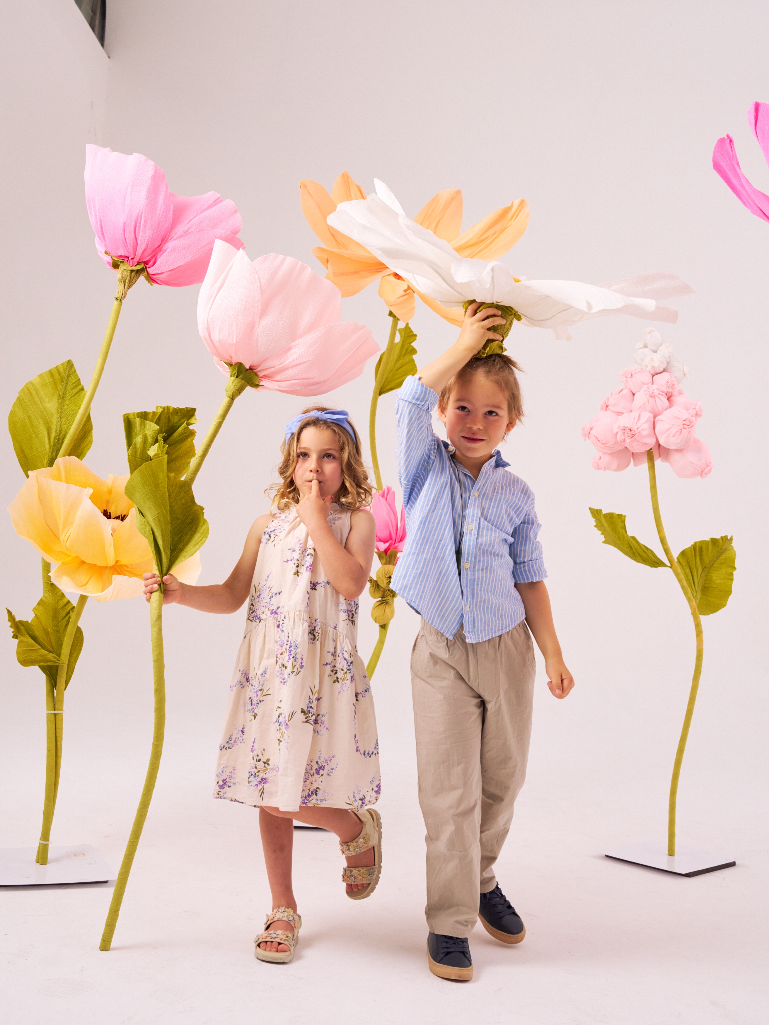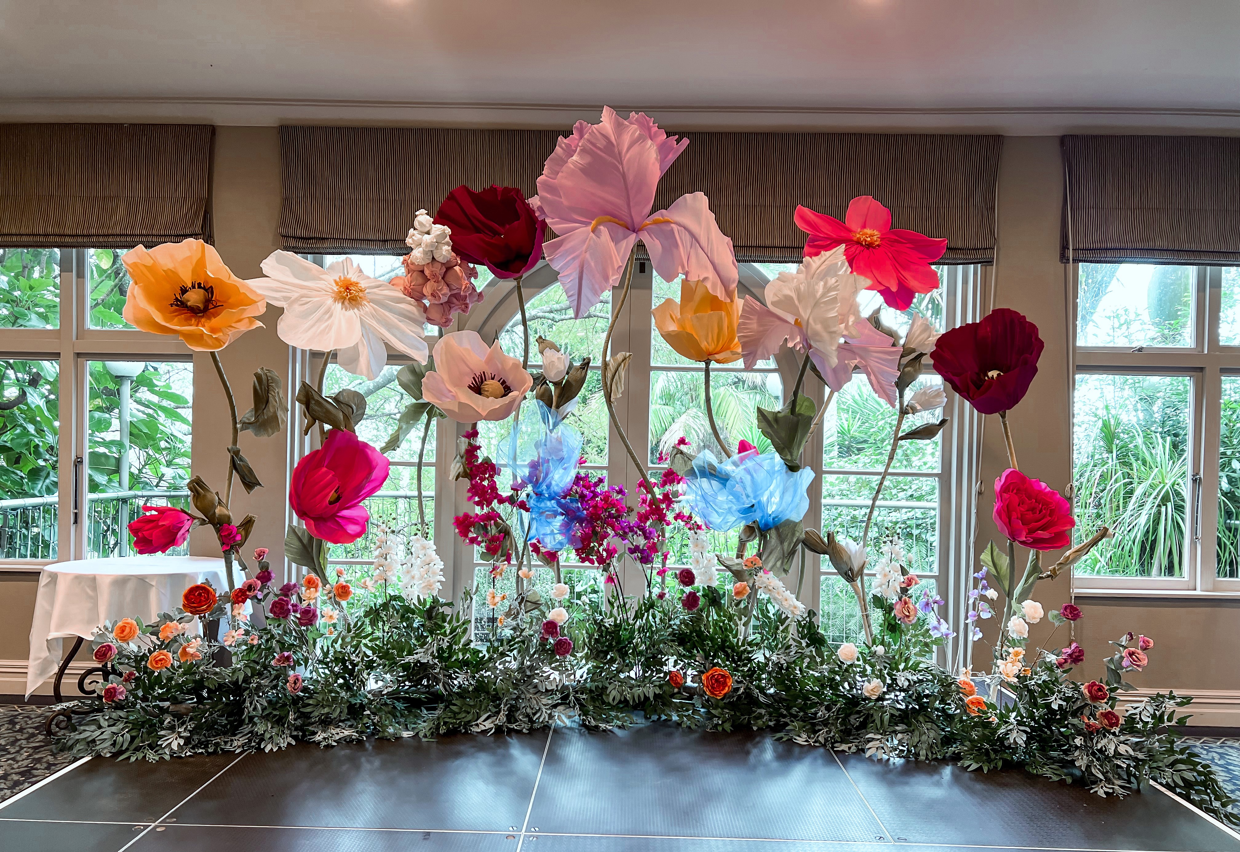 6 giant paper flowers. 2.4m H × approx. 1m wide. Available in bright, pastel, or white palette.