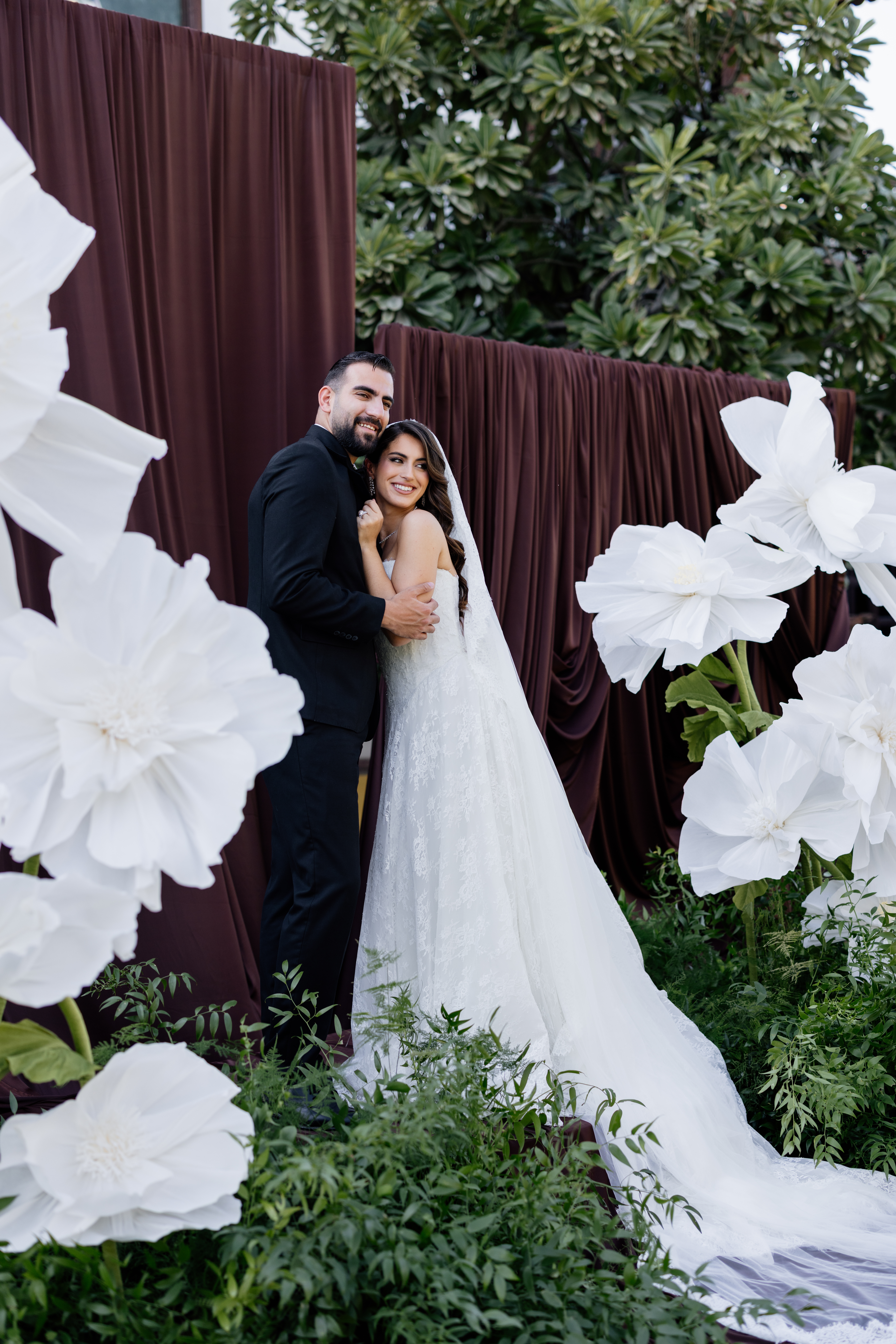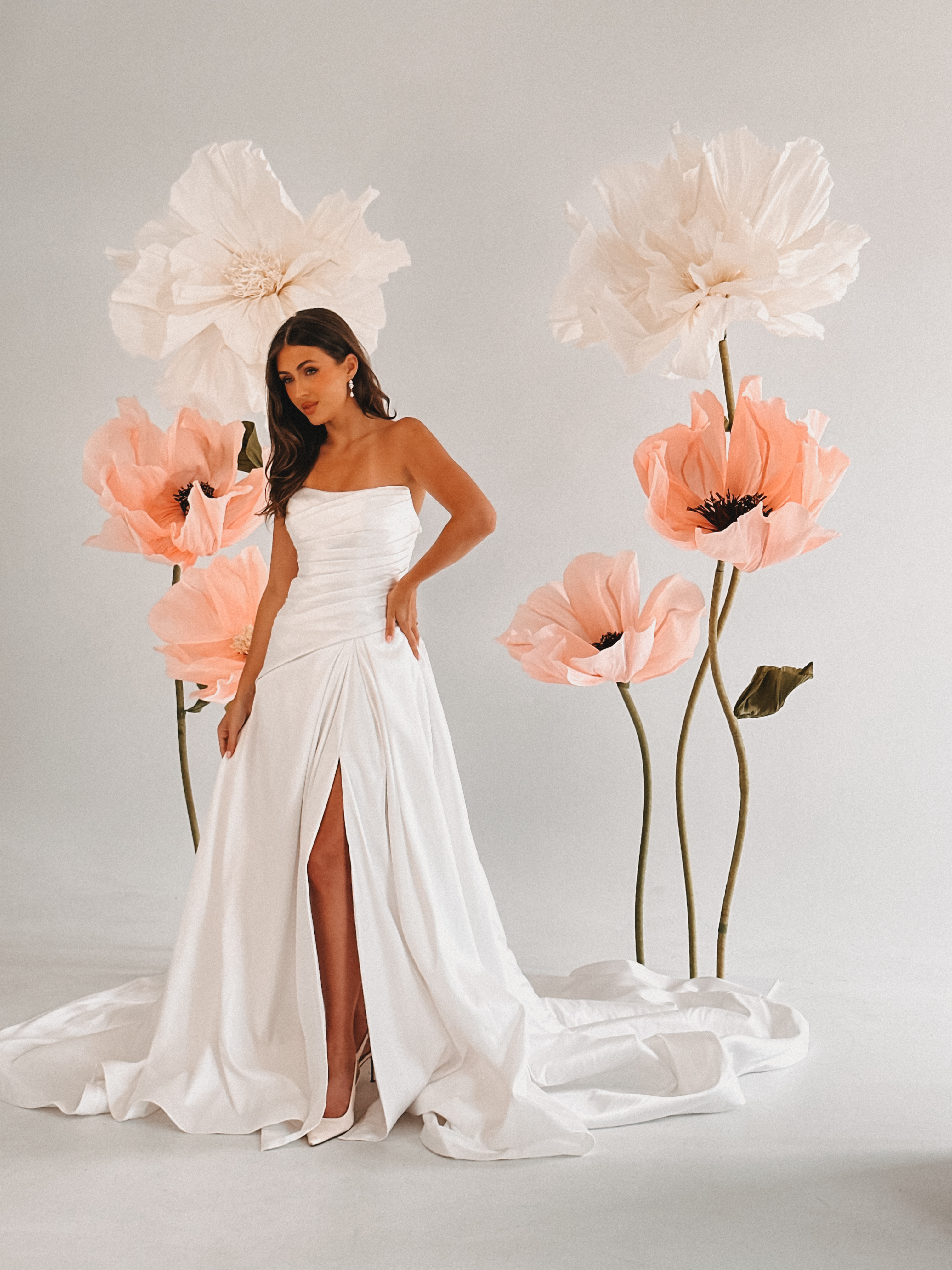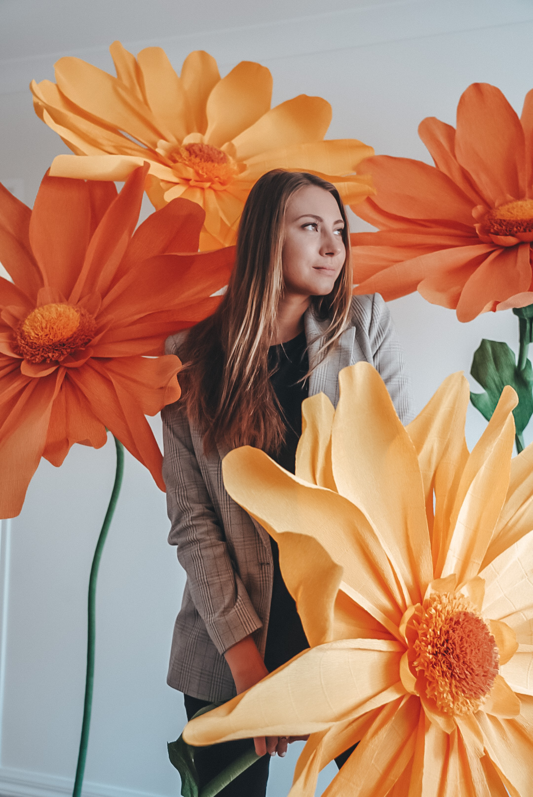 6 giant paper flowers. 2.4m H × approx. 1m wide. Available in bright, pastel, or white palette.