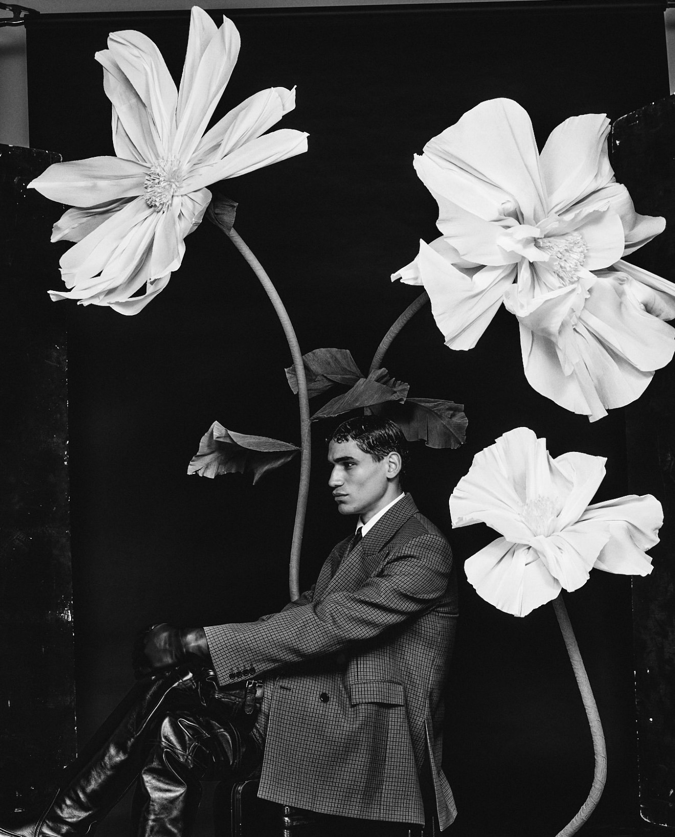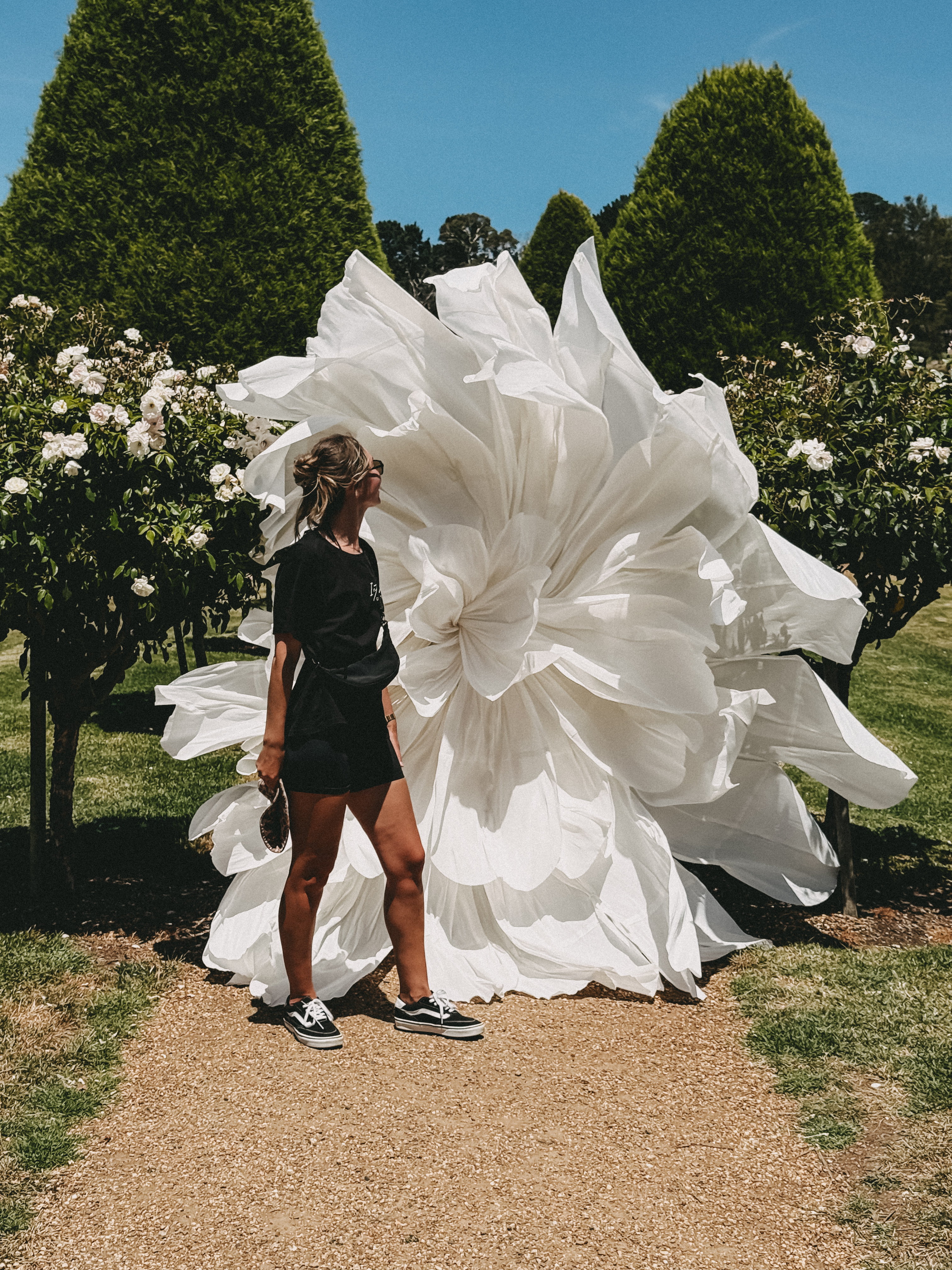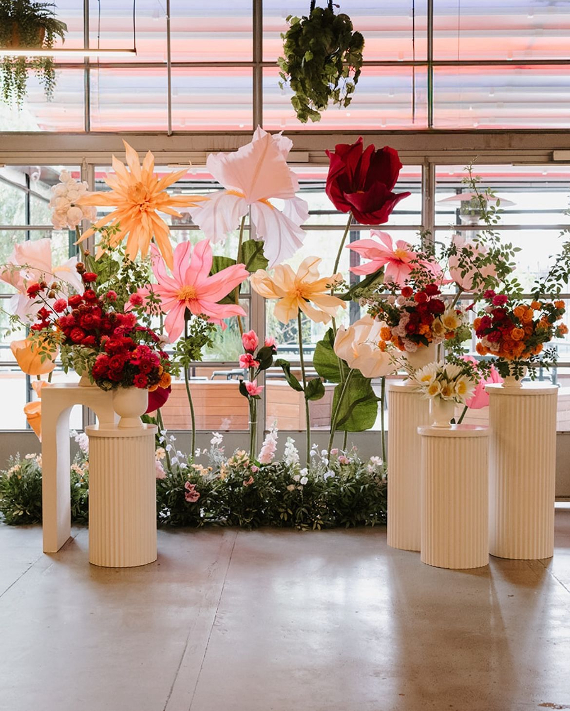 6 giant paper flowers. 2.4m H × approx. 1m wide. Available in bright, pastel, or white palette.
